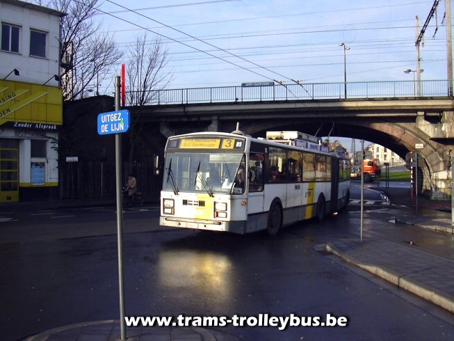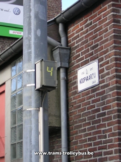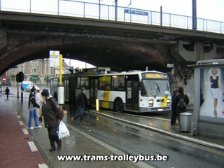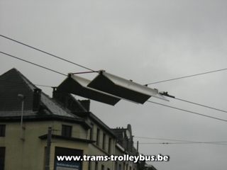 De 07 aan de halte 'Dampoort'. Zijn trolleystangen bevinden zich net aan de koolstofmeter. De 07 heeft een kwalijke reputatie van ontsporingen, net het omgekeerde van de 17, die daarop een goede reputatie heeft. Tegenwoordig zou het probleem opgelost zijn. |