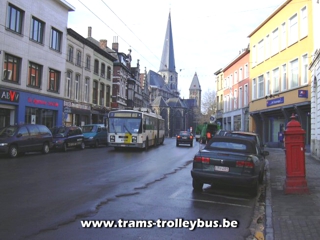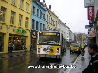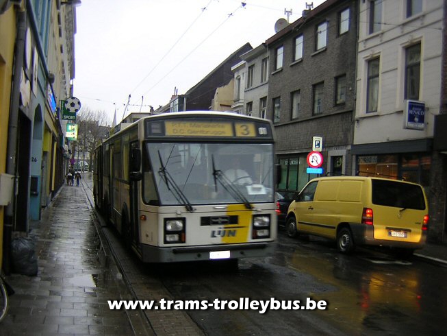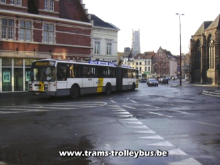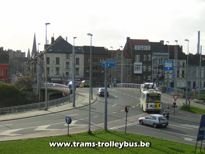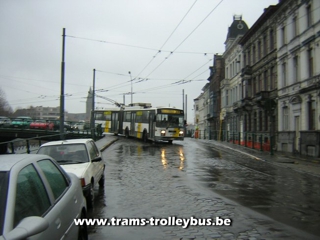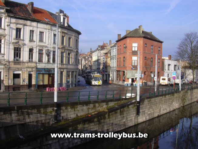 Gentbrugge. Na het Dampoort rond punt komt de trolleybus in de Dampoortstraat.21-3-04 |