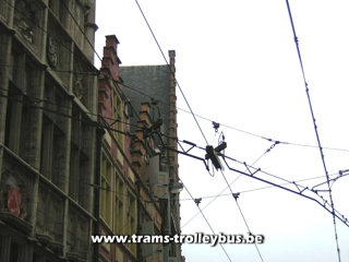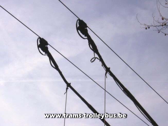 De trolleystangen van de 16 aan St Jacobs.