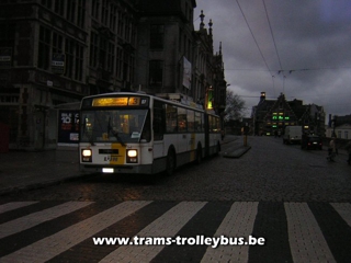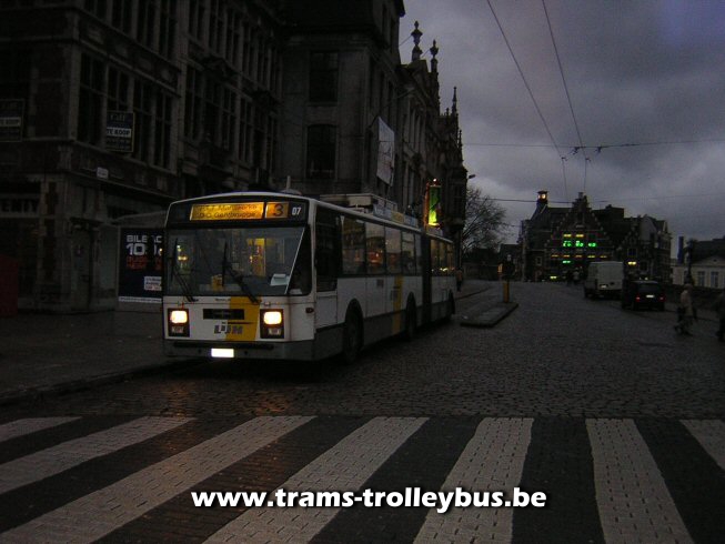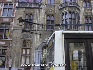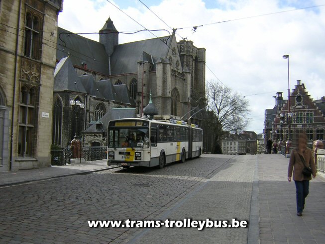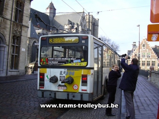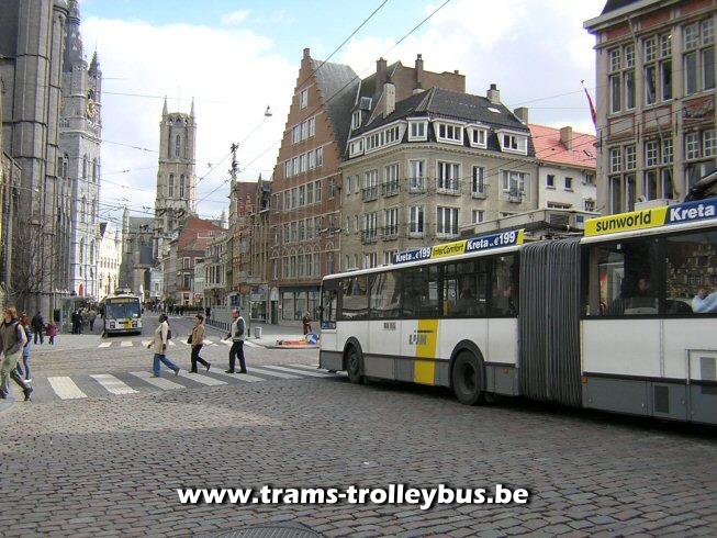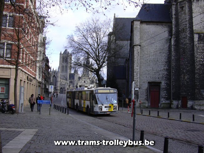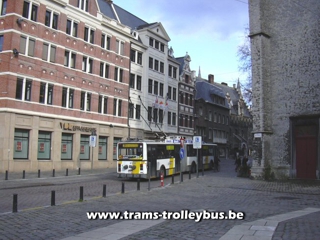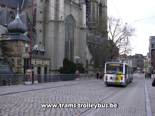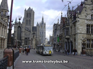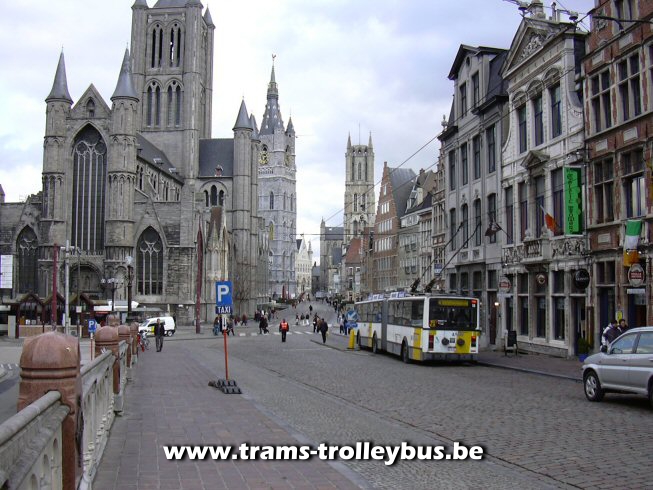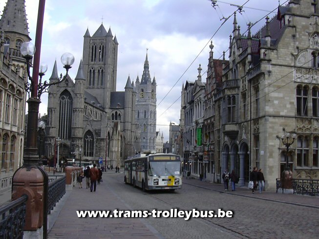 Een trolleybus staat aan de halte 'Korenmarkt'. Men ziet de drie torens, St Niklaas, het Belfort en St Bavo. 24-2-04 |