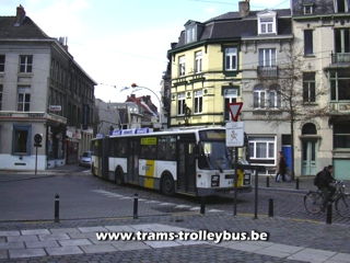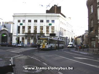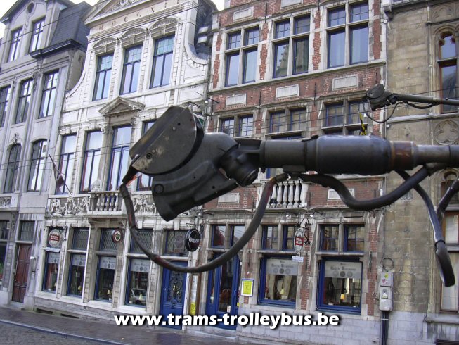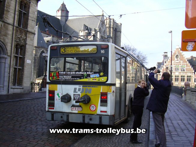 Het loodnot slaat toe bij de 16. De trolleys zijn ontspoord aan de oversteek van de tram 1 op de Korenmarkt. De chauffeuse probeert hem er terug op te leggen, wat hier op de St Michielshelling geen sinicure is. Als het regent, is het 'hersporen' pas echt mottig, dan stroomt er koolstof mee met de regen, op het hemd van de chauffeur, en dan moogt ge dat hemd wel vergeten. 24-2-04 |