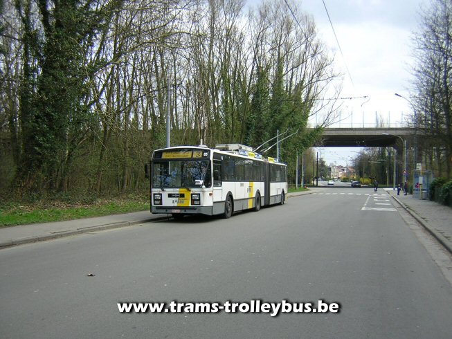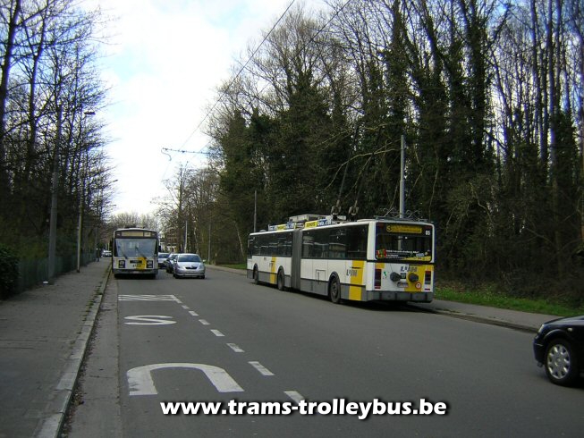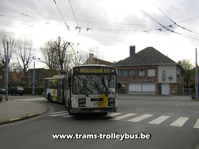 Aan het kasteel van Gentbrugge staat een mekanieker met de 05 te wachten, er wordt gewisseld van trolleybus. De 05 is naar hier gereden ook op diesel, door werken op de land van rodelaan, maar de stangen staan al tegen de draad. 21-3-04 |
