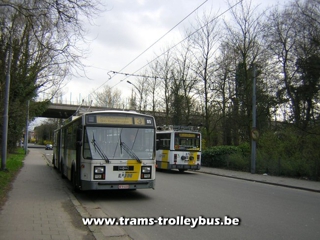 Aan de Meersemdries moeten de reizigers aan de overkant afstappen. De trolleybus zal rechtendoor rijden, richting stelplaats. 21-3-04 |