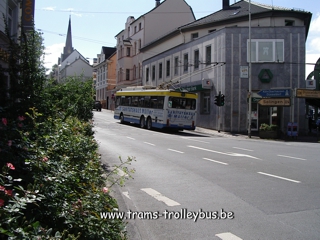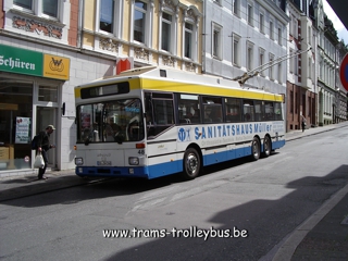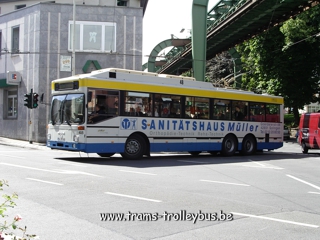 La ligne 683 est tout à fait particulière. Tout d'abord au terminus de Burg, par manque de place, il n'y a pas de boucle de retournement. Les trolleybus sont placés sur un plateau tournant qui effectue une rotation de 180°. Ce plateau était fermé pour travaux au moment où ces photos ont été prises. La deuxième particularité se trouve à l'autre extrémité de la ligne à Vohwinkel où les trolleybus rejoignent le Schwebebahn permettant aux voyageurs le désirant de se rendre à Wuppertal en empruntant le métro suspendu. Cette ligne est actuellement exploitée à l' aide des trolleybus MAN SL 172 HO. Un nombre important de ces véhicules a déjà été revendu à la ville de Sarajevo. Les véhicules encore en service (en très bon état) devraient à terme subir le même sort. Un appel d'offre auprès des constructeurs sera bientôt lancé pour la fourniture de nouveaux trolleybus (solo). |
