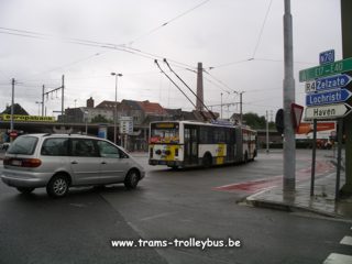 Cet autobus vient de Gentbrugge en ayant emprunté l'itinéraire de déviation. C'est par cette rue à l'arrière plan que les trolleybus arrivent et entrent en ligne en provenance du dépôt.