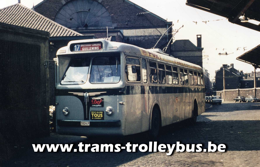 Construit en 1954, il ne s'agit pas d'un véhicule construit au départ d'un châssis de bus ou d'éléments de trams. Tout ici est "original" et pensé pour en faire un excellent trolleybus. 30 exemplaires furent construits. C'est vraiment ce qui se fit de mieux en Belgique. Il s'agit aussi du dernier véhicule de ce type construit en Wallonie. Ce trolleybus desservait les lignes 10 et 12. Le week-end, lorsque le service était réduit sur ces lignes, il desservait aussi les lignes 25 (photo ci-dessous), 37 & 38. Toutes le photos peuvent être agrandies en cliquant dessus. |